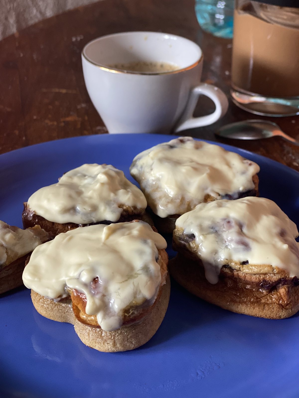 Малко преди да извадите мъфините, разтопете белия кувертюр на водна баня или в микровълнова. След кaто извадите кексчетата от фурната, полейте с разтопения шоколад. Оставете ги на стайна температура да изстинат и да се втвърди шоколада върху тях.